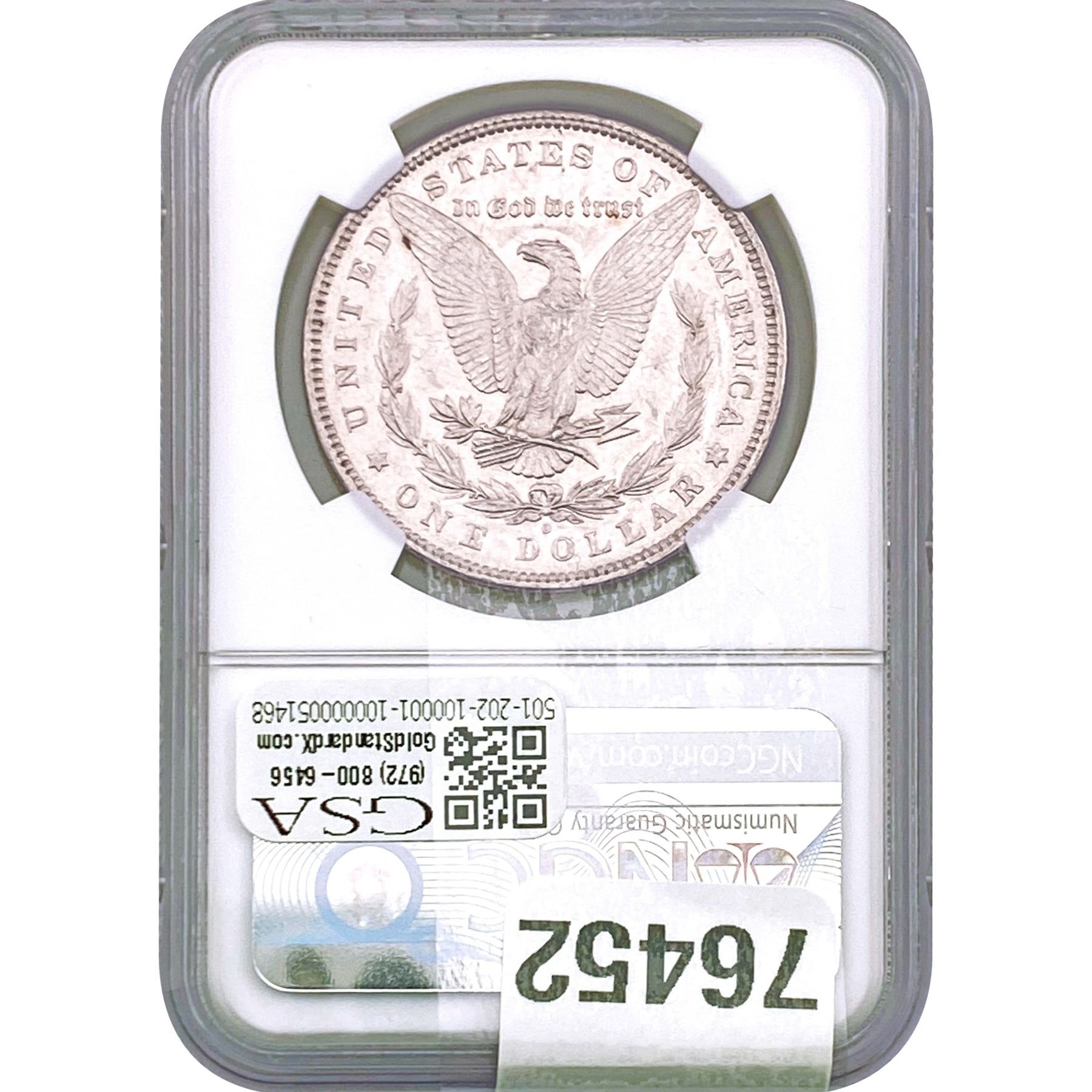 e. Coins sold referencing a third-party grading service are sold “AS IS” without any express or implied warranty, except for a guarantee by GSA that they are genuine. Removal or alteration of the holder, voids all of Bidder’s claims concerning that Product. Certain warranties may be available from the grading services and Bidders are referred to them for further details: Numismatic Guaranty Corporation (NGC), PO Box 4776, Sarasota, FL 34230, www.ngccoin.com/services/writtenguarantee.asp; Professional Coin Grading Services (PCGS), PO Box 9458, Newport Beach, CA 92658, www.pcgs.com/guarantee.html; ANACS, 6555 S. Kenton St., Ste. 303, Englewood, CO 80111; and Independent Coin Grading Co. (ICG), 7901 East Bellview, Ave., Suite 50, Englewood, CO 80111.