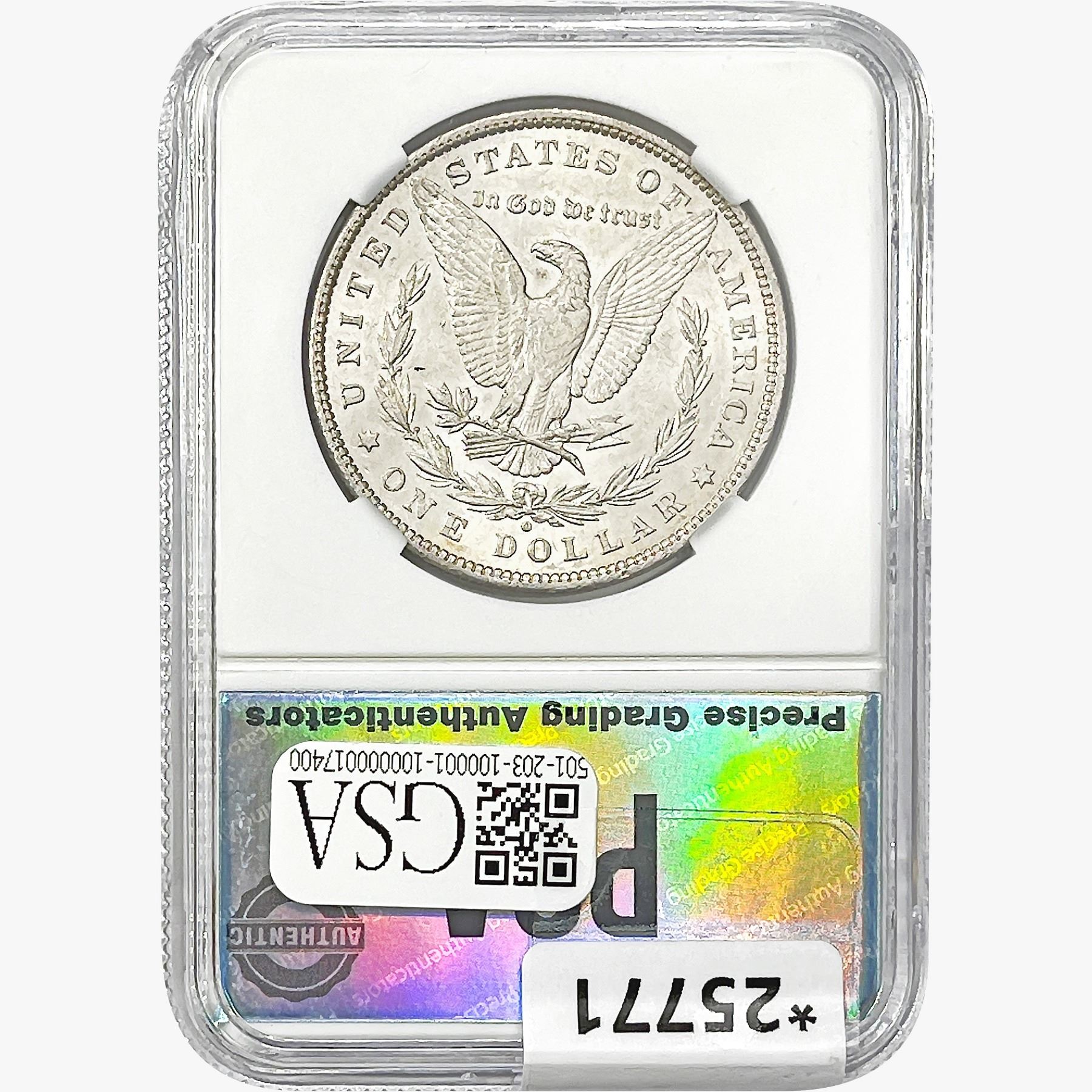 COINS AND CURRENCY LISTED IN GSA’S CATALOG AS GRADED AND ENCAPSULATED BY PCGS, NGC, ANACS, ICG, PCGS CURRENCY, PMG, PCGS BANKNOTE GRADING, CMC OR ANY OTHER THIRD-PARTY GRADING SERVICE ARE LIKEWISE SOLD “AS-IS” EXCEPT AS EXPRESSLY SET FORTH HEREIN. ALL THIRD-PARTY GRADING SERVICE GUARANTEES, INCLUDING AUTHENTICITY, ARE THE SOLE RESPONSIBILITY OF THE THIRD-PARTY GRADING SERVICE AND NOT WARRANTIES OR GUARANTEES OF GSA. BIDDERS SHOULD CONTACT THESE THIRD-PARTY GRADING SERVICES DIRECTLY WITH RESPECT TO ANY CLAIMS OR QUESTIONS THEY MAY HAVE CONCERNING THEIR GUARANTEES AND WARRANTIES. BIDDERS ACKNOWLEDGE AND AGREE THAT AUCTIONEER IS NOT BOUND BY OR LIABLE FOR ANY OPINION OR CERTIFICATION BY ANY THIRD-PARTY GRADING SERVICE. REMOVAL OF A PRODUCT FROM ITS PROTECTIVE CASING OR HOLDER OR ALTERATION OF ANY COIN HOLDER WAIVES ALL RIGHTS CONCERNING THE PRODUCT CONTAINED THEREIN.