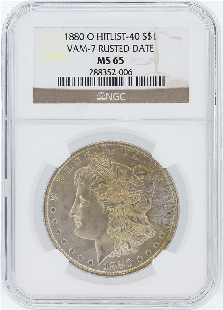 One 1880-O NGC MS65 Hitlist-40 VAM-7 Rusted Date Morgan Silver Dollar. NGC attributed this coin as a Hit List-40 VAM-7 Rusted Date. This coin is a perfect addition to any novice or sophisticated coin collector. NGC Certified.