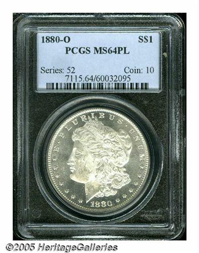 <B>1880-O<S$1> 8/7 MS64 Prooflike PCGS.</B></I> VAM-5. A Top 100 Variety. Nearly colorless prooflike example with flashy fields and frosty devices. Lightly scuffed, as typical, across the obverse. The present example has an "oval O" reverse, which is considered the rarer of the VAM-5 types.