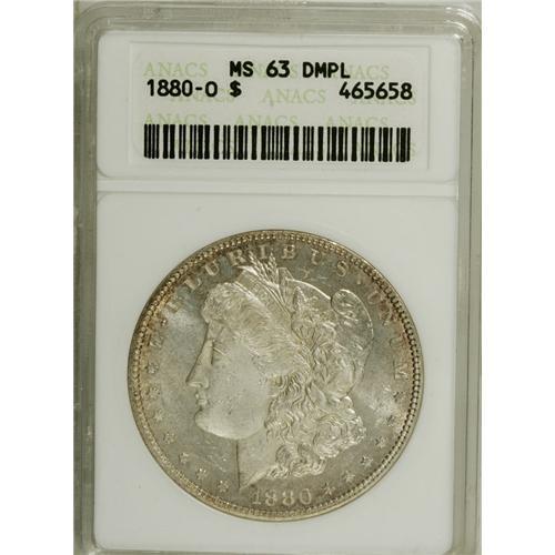 <B>1880-O S$1 MS63 Deep Mirror Prooflike ANACS.</B></I> Whispers of reddish or gold-brown color make occasional visits to the peripheries of this sharply struck New Orleans issue. Lightly abraded surfaces reveal strong motif-field contrast.<BR><BR><b>Shipping:</b> Coins & Currency (<a target="_blank" href="http://www.heritageauctions.com/common/shipping.php">view shipping information</a>)