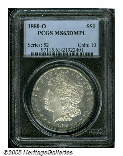 <B>1880-O<S$1> MS63 Deep Mirror Prooflike PCGS.</B></I> Frosty, well struck devices stand out against deep mirrored fields. Wisps of light tan patina are seen here and there, and the few marks that are present are consistent with the grade. Population: 50 in 63, 38 finer (6/05).