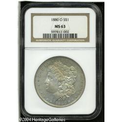 1880-O S$1 MS63 NGC. Golden-gray toning with surpr <B>1880-O S$1 MS63 NGC.</B></I> Golden-gray toning with surprisingly strong underlying mint luster. <BR><BR><B>Important notice:</B> Heritage usually auctions material at the rate of 200-250 lots per hour. On some occasions eBay Live bid software or the Internet may not be able to keep up with the pace of the auction. We recommend placing a realistic absentee bid now as insurance to avoid disappointment. Occasionally the auctioneer may eliminate or reject an eBay Live bid, and the auctioneer may also reopen a lot after the close of the eBay live bidding (usually because we missed an audience bid), and may reject your bid even if it shows you as the winning bidder. By bidding via eBay Live, you agree that Heritage may award the lot to another bidder at its sole discretion under the circumstances described above or any other reasonable circumstances. Since eBay bids are not shown to us until we open the lot on the floor, we treat those bids just like floor bids. In most cases the floor responds before the eBay bid is presented to us, due to Internet lag time, so for consistency we have made it a policy that floor bids are always considered first over tie eBay live bids. Also please note that all Heritage lots purchased through eBay Live carry a 20% Buyer's Premium. Please make sure you read the Terms and Conditions before you bid. This lot is being auctioned in conjunction with a live floor auction by Heritage Galleries & Auctioneers. All final auction and invoice information will be supplied by Heritage Galleries & Auctioneers, and all other information should be considered preliminary. Lot:7354