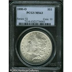 1880-O S$1 MS63 PCGS. Boldly detailed for an O-min <B>1880-O S$1 MS63 PCGS.</B></I> Boldly detailed for an O-mint dollar, with good central details, this satiny piece is untoned, with a lovely creamy texture to the bright surfaces. The grade is limited by the presence of a few moderate blemishes on each side of the coin. <BR><BR><B>Important notice:</B> Heritage usually auctions material at the rate of 200-250 lots per hour. On some occasions eBay Live bid software or the Internet may not be able to keep up with the pace of the auction. We recommend placing a realistic absentee bid now as insurance to avoid disappointment. Occasionally the auctioneer may eliminate or reject an eBay Live bid, and the auctioneer may also reopen a lot after the close of the eBay live bidding (usually because we missed an audience bid), and may reject your bid even if it shows you as the winning bidder. By bidding via eBay Live, you agree that Heritage may award the lot to another bidder at its sole discretion under the circumstances described above or any other reasonable circumstances. Since eBay bids are not shown to us until we open the lot on the floor, we treat those bids just like floor bids. In most cases the floor responds before the eBay bid is presented to us, due to Internet lag time, so for consistency we have made it a policy that floor bids are always considered first over tie eBay live bids. Also please note that all Heritage lots purchased through eBay Live carry a 20% Buyer's Premium. Please make sure you read the Terms and Conditions before you bid. This lot is being auctioned in conjunction with a live floor auction by Heritage Galleries & Auctioneers. All final auction and invoice information will be supplied by Heritage Galleries & Auctioneers, and all other information should be considered preliminary. Lot:7353