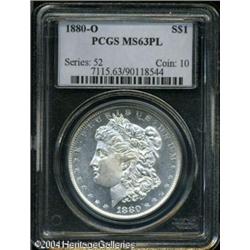 1880-O S$1 MS63 Prooflike PCGS. A nearly untoned e <B>1880-O S$1 MS63 Prooflike PCGS.</B></I> A nearly untoned example that has radiant fields and a meticulous strike. Unmarked for the Select grade, and a difficult issue to find Prooflike. <BR><BR><B>Important notice:</B> Heritage usually auctions material at the rate of 200-250 lots per hour. On some occasions eBay Live bid software or the Internet may not be able to keep up with the pace of the auction. We recommend placing a realistic absentee bid now as insurance to avoid disappointment. Occasionally the auctioneer may eliminate or reject an eBay Live bid, and the auctioneer may also reopen a lot after the close of the eBay live bidding (usually because we missed an audience bid), and may reject your bid even if it shows you as the winning bidder. By bidding via eBay Live, you agree that Heritage may award the lot to another bidder at its sole discretion under the circumstances described above or any other reasonable circumstances. Since eBay bids are not shown to us until we open the lot on the floor, we treat those bids just like floor bids. In most cases the floor responds before the eBay bid is presented to us, due to Internet lag time, so for consistency we have made it a policy that floor bids are always considered first over tie eBay live bids. Also please note that all Heritage lots purchased through eBay Live carry a 20% Buyer's Premium. Please make sure you read the Terms and Conditions before you bid. This lot is being auctioned in conjunction with a live floor auction by Heritage Galleries & Auctioneers. All final auction and invoice information will be supplied by Heritage Galleries & Auctioneers, and all other information should be considered preliminary. Lot:7356