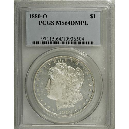 <B>1880-O S$1 MS64 Deep Mirror Prooflike PCGS.</B></I> The 1880-O is a notable condition rarity among early dollars and it is seldom seen with prooflike or deep prooflike fields. This is an exceptional white-on-black cameo coin that shows terrific eye appeal. Both sides are brilliant and there are only a few small abrasions and luster grazes that keep this lovely piece from the Gem category. Population: 38 in 64, 1 finer (12/06).<BR><BR><b>Shipping:</b> Coin/Currency (<a target="_blank" href="http://www.heritageauctions.com/common/shipping.php">view shipping information</a>)