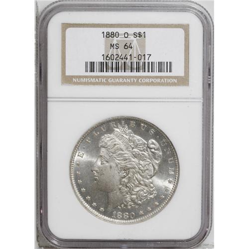 <B>1880-O<img border='0' src='http://www.heritagecoins.com/images/star.gif' width=10 height=10>$1> MS64 NGC.</B></I> Brilliant throughout and clean for this conditionally challenging Morgan dollar. Sharply struck and a high-end example of this scarcer O-mint issue.