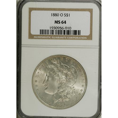 <B>1880-O S$1 MS64 NGC.</B></I> Micro O. Light but consistent tan-gray toning visits this lustrous and intricately struck near-Gem. Liberty's cheek is well preserved, as are the fields. Surprisingly rare any finer.<BR><BR><b>Shipping:</b> Coins & Currency (<a target="_blank" href="http://www.heritageauctions.com/common/shipping.php">view shipping information</a>)