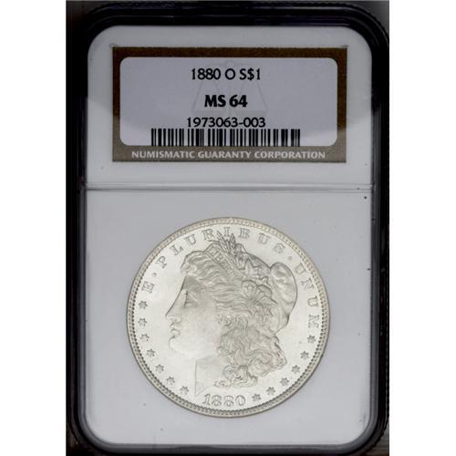 <B>1880-O<img border='0' src='http://www.heritagecoins.com/images/star.gif' width=10 height=10>$1> MS64 NGC.</B></I> Micro O. Well struck with silver-gray surfaces that display a bright cartwheel sheen in the fields and very few wispy surface blemishes. A minor abrasion is noted on the eagle's lower abdomen. Exceedingly scarce and quite costly any finer.