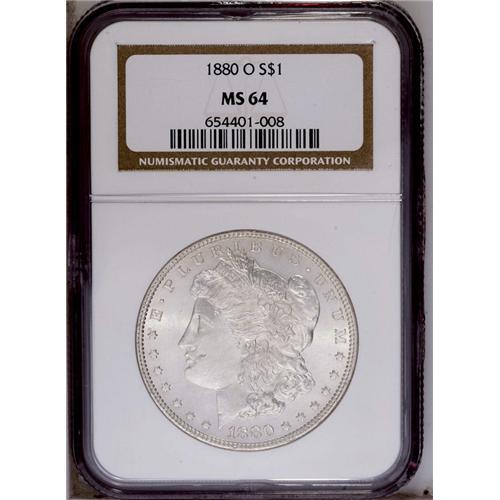 <B>1880-O<img border='0' src='http://www.heritagecoins.com/images/star.gif' width=10 height=10>$1> MS64 NGC.</B></I> One mark on Liberty's cheek has kept this better date New Orleans issue from the coveted Gem level. An otherwise exemplary coin with soft luster and a strong strike. <BR><BR><B>Important notice:</B> Heritage usually auctions material at the rate of 200-250 lots per hour. On some occasions eBay Live bid software or the Internet may not be able to keep up with the pace of the auction. We recommend placing a realistic absentee bid now as insurance to avoid disappointment. Occasionally the auctioneer may eliminate or reject an eBay Live bid, and the auctioneer may also reopen a lot after the close of the eBay live bidding (usually because we missed an audience bid), and may reject your bid even if it shows you as the winning bidder. By bidding via eBay Live, you agree that Heritage may award the lot to another bidder at its sole discretion under the circumstances described above or any other reasonable circumstances. Since eBay bids are not shown to us until we open the lot on the floor, we treat those bids just like floor bids. In most cases the floor responds before the eBay bid is presented to us, due to Internet lag time, so for consistency we have made it a policy that floor bids are always considered first over tie eBay live bids. Also please note that all Heritage lots purchased through eBay Live carry a 20% Buyer's Premium. Please make sure you read the Terms and Conditions before you bid. This lot is being auctioned in conjunction with a live floor auction by Heritage Galleries & Auctioneers. All final auction and invoice information will be supplied by Heritage Galleries & Auctioneers, and all other information should be considered preliminary. Lot:3280 <BR><BR><B>Winning Notification and Billing:</B> After the FINAL session in this auction is complete, Heritage will send e-mail and snail mail invoices. This process normally takes several days. All final auction and invoice information will be supplied by Heritage Galleries & Auctioneers, and all other information should be considered preliminary. <BR><BR>This auction will be conducted on a live auction floor and over the Internet through eBay Live. If you choose to place an absentee bid, please take a moment to <font color='#0000ff'><u><a href='http://pages.ebay.com/liveauctions/help/before/laabsentee.html'>learn how eBay Live absentee bidding works</a></u></font><font color='#000000'>