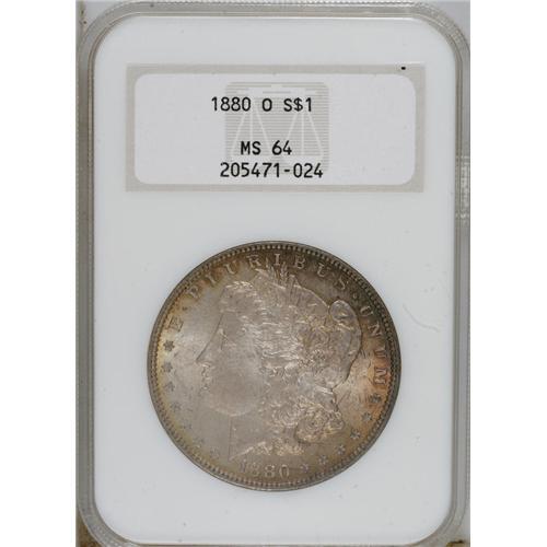 <B>1880-O S$1 MS64 NGC.</B></I> Oval O. Rich golden-brown and powder-blue bands grace the margins, while the fields and devices are dove-gray. This is a beautifully preserved near-Gem that has only slight softness on the hair above Liberty's ear. Encased in a prior generation holder.<BR><BR><b>Shipping:</b> Coins & Currency (<a target="_blank" href="http://www.heritageauctions.com/common/shipping.php">view shipping information</a>)