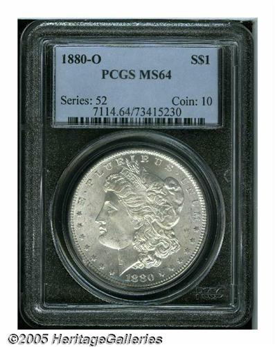<B>1880-O<S$1> MS64 PCGS.</B></I> Boldly defined, in fact tantalizingly close to fully struck, with satiny, untoned fields and frosty-white features. Just the slightest luster grazes on Liberty's cheek have kept this lovely '80-O from a monumental leap to Gem status.