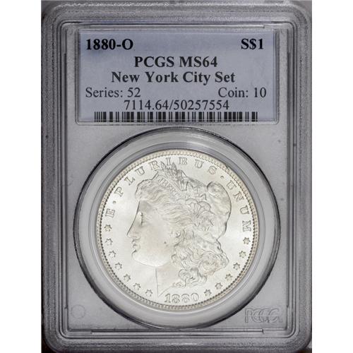 <B>1880-O<img border='0' src='http://www.heritagecoins.com/images/star.gif' width=10 height=10>$1> MS64 PCGS.</B></I> New York City Set. An undisturbed, sharply struck, and lustrous near-Gem. The 1880-O is an unsung conditional rarity, and those who seek a high end MS64 in the place of a costly MS65 will do well to consider the present example.<BR><I>Ex: Palm Beach Signature (Heritage, 11/04), lot 9353, which realized $8,050.</B></I><BR><I>From The Michael Casper Collection, Part Three.</B></I>