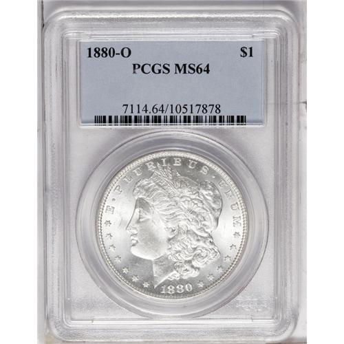 <B>1880-O<img border='0' src='http://www.heritagecoins.com/images/star.gif' width=10 height=10>$1> MS64 PCGS.</B></I> Great luster and a worthy strike give this brilliant piece eye appeal. A few shallow abrasions on Liberty's cheek are consistent with the grade.