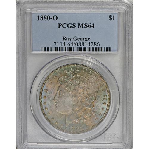 <B>1880-O S$1 MS64 PCGS.</B></I> Micro O. Gold, peach, ice-blue, and aquamarine swirls engulf this lustrous and carefully preserved near-Gem. A series of small die breaks on the right obverse rim may be of interest to the specialist.<BR><I>From The Cocoa Beach Collection.</B></I><BR><BR><b>Shipping:</b> Coin/Currency (<a target="_blank" href="http://www.heritageauctions.com/common/shipping.php">view shipping information</a>)