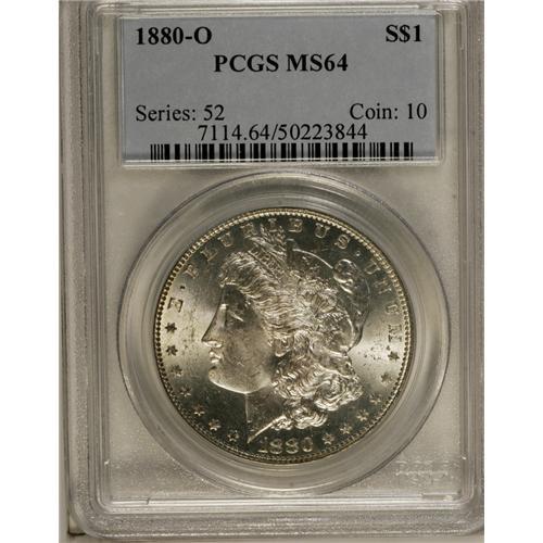 <B>1880-O S$1 MS64 PCGS.</B></I> Spectacular luster radiates from nearly untoned surfaces. Sharply struck, with just a few grade-defining marks.<BR><BR><b>Shipping:</b> Coin/Currency (<a target="_blank" href="http://www.heritageauctions.com/common/shipping.php">view shipping information</a>)