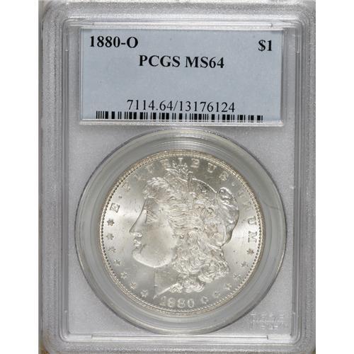 <B>1880-O S$1 MS64 PCGS.</B></I> This piece represents excellent value as it is an upper-end MS64 with most of the visual appeal of a full Gem at a fraction of the cost of an MS65. Brilliant throughout, the surfaces are remarkably clean and display bright mint luster. Fully struck.<BR><BR><b>Shipping:</b> Coins & Currency (<a target="_blank" href="http://www.heritageauctions.com/common/shipping.php">view shipping information</a>)