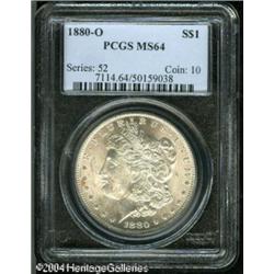 1880-O S$1 MS64 PCGS. This well struck near-Gem fe <B>1880-O S$1 MS64 PCGS.</B></I> This well struck near-Gem features potent luster and clean fields. A dab of golden-brown color is at 9 o'clock on the obverse. A beautiful New Orleans Silver Dollar. <BR><BR><B>Important notice:</B> Heritage usually auctions material at the rate of 200-250 lots per hour. On some occasions eBay Live bid software or the Internet may not be able to keep up with the pace of the auction. We recommend placing a realistic absentee bid now as insurance to avoid disappointment. Occasionally the auctioneer may eliminate or reject an eBay Live bid, and the auctioneer may also reopen a lot after the close of the eBay live bidding (usually because we missed an audience bid), and may reject your bid even if it shows you as the winning bidder. By bidding via eBay Live, you agree that Heritage may award the lot to another bidder at its sole discretion under the circumstances described above or any other reasonable circumstances. Since eBay bids are not shown to us until we open the lot on the floor, we treat those bids just like floor bids. In most cases the floor responds before the eBay bid is presented to us, due to Internet lag time, so for consistency we have made it a policy that floor bids are always considered first over tie eBay live bids. Also please note that all Heritage lots purchased through eBay Live carry a 20% Buyer's Premium. Please make sure you read the Terms and Conditions before you bid. This lot is being auctioned in conjunction with a live floor auction by Heritage Galleries & Auctioneers. All final auction and invoice information will be supplied by Heritage Galleries & Auctioneers, and all other information should be considered preliminary. Lot:7355