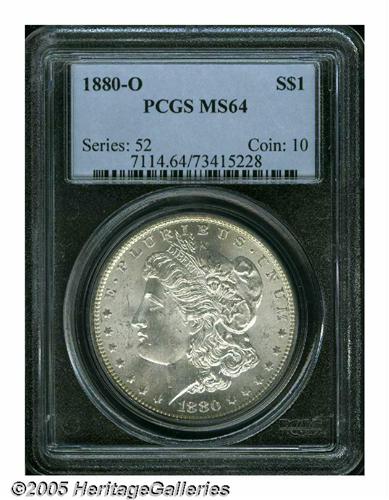 <B>1880-O<S$1> MS64 PCGS.</B></I> Well struck with bright satiny luster, and a slight degree of scattered milky patina on each side, on the lightly marked silver-gray surfaces. A conditionally scarce issue that becomes rare above the MS64 grade level.
