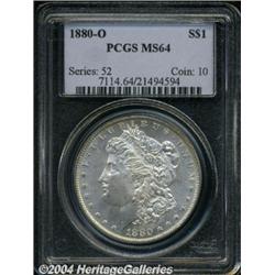 <B>1880-O<S$1> MS64 PCGS.</B></I> This nearly untoned and brilliant specimen is sharply struck, and reveals just a few light contacts that limit the grade. <BR><BR><B>Important notice:</B> Heritage usually auctions material at the rate of 200-250 lots per hour. On some occasions eBay Live bid software or the Internet may not be able to keep up with the pace of the auction. We recommend placing a realistic absentee bid now as insurance to avoid disappointment. Occasionally the auctioneer may eliminate or reject an eBay Live bid, and the auctioneer may also reopen a lot after the close of the eBay live bidding (usually because we missed an audience bid), and may reject your bid even if it shows you as the winning bidder. By bidding via eBay Live, you agree that Heritage may award the lot to another bidder at its sole discretion under the circumstances described above or any other reasonable circumstances. Since eBay bids are not shown to us until we open the lot on the floor, we treat those bids just like floor bids. In most cases the floor responds before the eBay bid is presented to us, due to Internet lag time, so for consistency we have made it a policy that floor bids are always considered first over tie eBay live bids. Also please note that all Heritage lots purchased through eBay Live carry a 20% Buyer's Premium. Please make sure you read the Terms and Conditions before you bid.