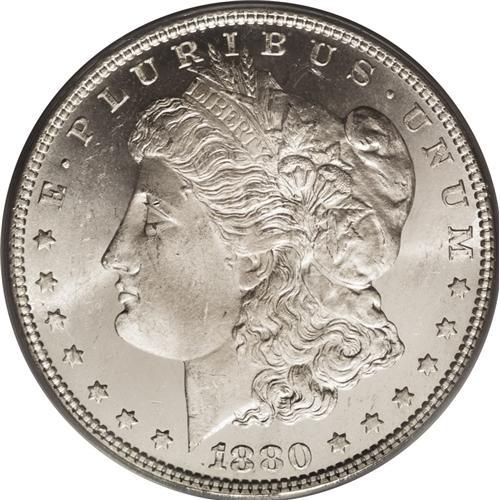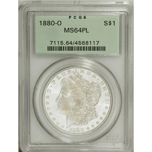 <B>1880-O S$1 MS64 Prooflike PCGS.</B></I> Just the slightest bit of light tan color shows on the central devices, with an appreciable degree of contrast between the chalk-white features and glassy fields. the design elements are well impressed throughout. Although occasionally found with prooflike qualities, very few 1880-O dollars have the added advantage of Choice surfaces. Population: 18 in 64 Prooflike, 1 finer (10/06).<BR><BR><b>Shipping:</b> Coin/Currency (<a target="_blank" href="http://www.heritageauctions.com/common/shipping.php">view shipping information</a>)