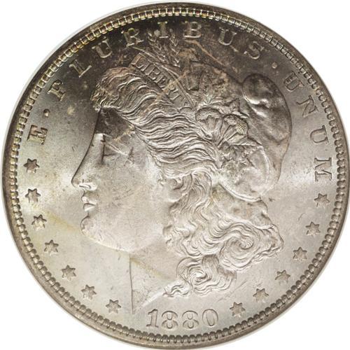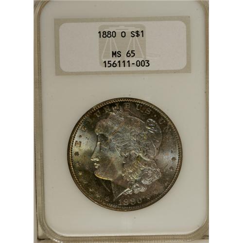 <B>1880-O S$1 MS65 NGC.</B></I> The 1880-O is one of the great condition rarities among O-mint Morgan dollars, although one would never know it by looking at the preponderance of AUs and relative availability up to and including MS 63 grade. Only at the Choice level is there a dramatic drop-off of survivors and, of course, MS65 examples such as this are nearly unobtainable. This Gem's exceptional lack of surface marks immediately sets it apart from the typical uncirculated '80-O. The obverse is tinted in delicate steel-blue shades while deeper blushes of coppery-orange color are noticed at the borders on each side. Census: 20 in 65, 0 finer (10/06).<BR><BR><b>Shipping:</b> Coin/Currency (<a target="_blank" href="http://www.heritageauctions.com/common/shipping.php">view shipping information</a>)