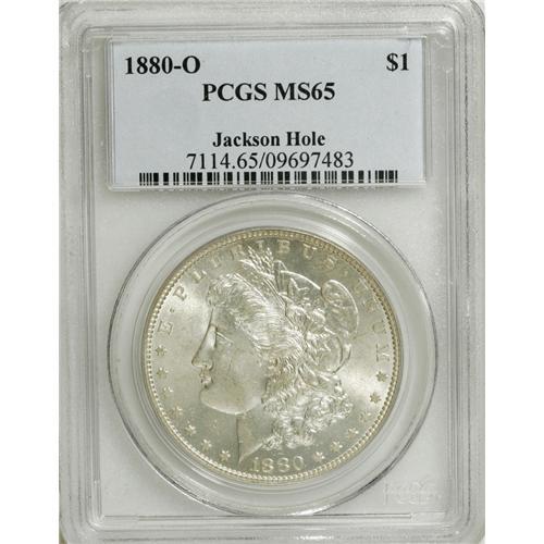 <B>1880-O S$1 MS65 PCGS.</B></I> The 1880-O Morgan dollar is one of the condition rarities in this series, with AU and low level Mint State coins easily located. Even at the MS64 grade level, this date is not particularly difficult to find, with about 1,000 examples certified as Choice Mint State by PCGS. However, one additional step up the grading scale dramatically changes the picture. This piece is one of just 25 Gem examples certified by PCGS (2/07), including varieties and prooflike coins. The Gem offered here is an impressive and highly lustrous piece with frosty silver surfaces. Both sides are brilliant with only faint traces of champagne toning. A few minuscule surface marks scattered across each side prevent a higher grade.<BR><I>From The Jackson Hole Collection.</B></I><BR><BR><b>Shipping:</b> Coins & Currency (<a target="_blank" href="http://www.heritageauctions.com/common/shipping.php">view shipping information</a>)