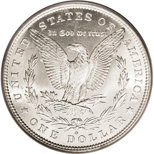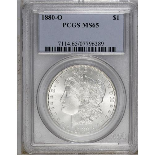 <B>1880-O<img border='0' src='http://www.heritagecoins.com/images/star.gif' width=10 height=10>$1> MS65 PCGS.</B></I> The 1880-O is one of the great condition rarities in the entire Morgan dollar series, being common up to and including the MS63 grade level, and then quickly dropping off to nearly unobtainable status in MS65. Only 38 Gems have been certified by the two major services, an astonishingly low number considering the original mintage of 5.3 million pieces.<BR> This coin's exceptional lack of surface marks immediately sets it apart from the typical Uncirculated '80-O, with the frosty fields being especially clean on the obverse. The striking details are exceptional for a New Orleans Mint silver dollar, and are essentially full, even over the centers. A bright sheen encompasses each side, and beautifully complements the silver-white surfaces. Population: 18 in 65, 0 finer (9/06).