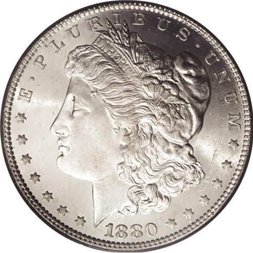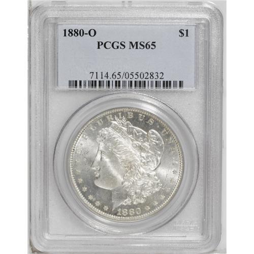 <B>1880-O<img border='0' src='http://www.heritagecoins.com/images/star.gif' width=10 height=10>$1> MS65 PCGS.</B></I> Unlike the Philadelphia and San Francisco Mint issues of 1880, the 1880-O is very difficult to obtain as a Gem. The issue must have been carelessly stored in the New Orleans Mint vaults, as the lower mintage 1879-O is actually more available in lofty grades. Most Uncirculated survivors are bagmarked, and only a miniscule portion can claim the preservation of the present example. Each side presents a brilliant, untoned appearance and the details are well defined including Liberty's hair over her ear and the eagle's breast feathers. A partially reflective quality is seen in the fields. Close examination fails to reveal any singularly mentionable marks or abrasions. Population: 18 in 65, 0 finer (7/06).