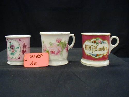 1880, OCCUPATIONAL & DECORATIVE MUGS INCLUDES (1) NAME W/FLORAL W.G. LAWTON (BASE FLAKE), (1) DECORATIVE GERMAN ROSE TRANSFER (RIM W/FLEA NIP), (1) DECORATIVE MUG, 3 PC