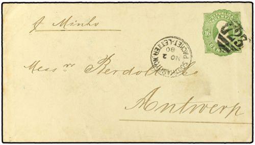 1880 Postal stationary envelope 16 cent green addressed to ANTWERP sent on the steamer "Minho" cancelled in transit by "723" Southampton with adjacent SOUTHAMPTON PACKET LETTER (Robertson P3) cds. RARE.