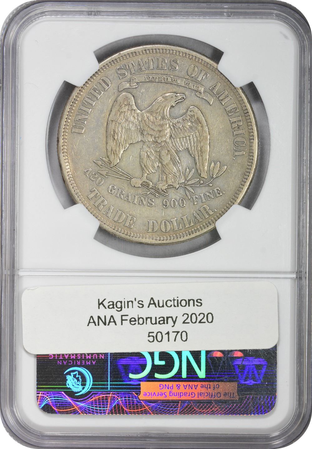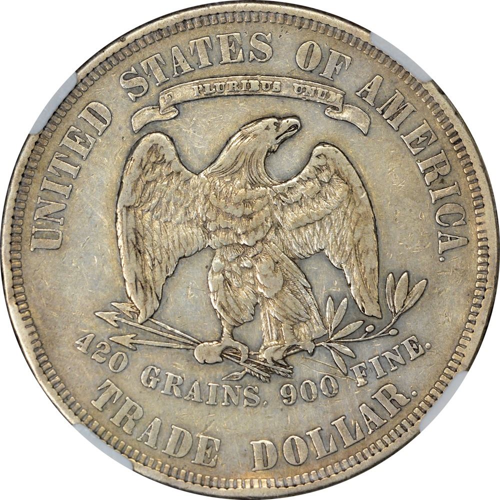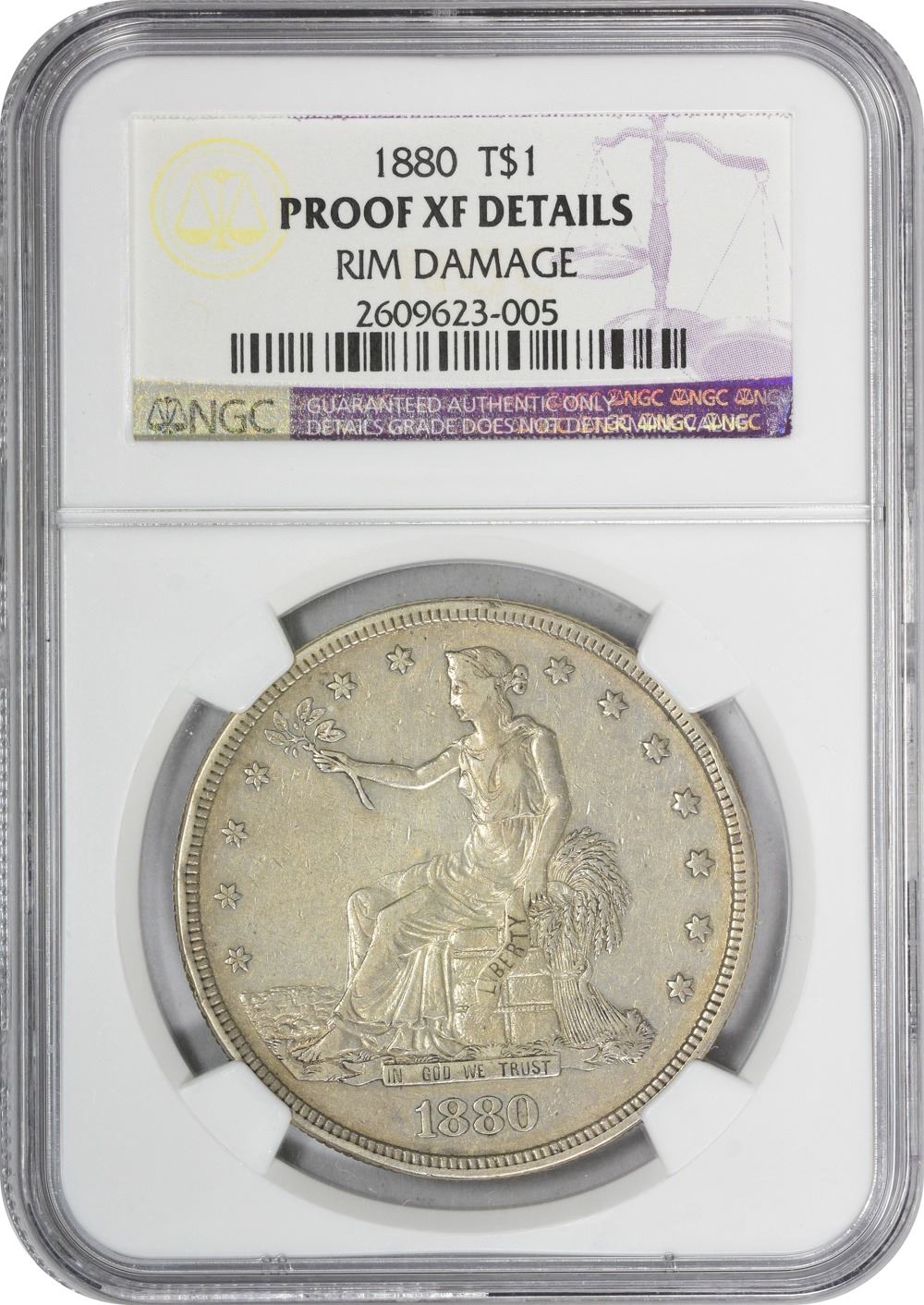 Steel-gray with a soft golden glow. Struck only in Proof format, this particular 1880 Proof-only trade dollar. Slight rim bruises on the obverse at 2 and 9 o’clock, and on the reverse at 3, 6, and 9 o’clock.