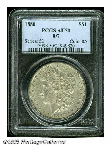 <B>1880<S$1> 8 Over 7 AU50 PCGS.</B></I> VAM-7. A Top 100 Variety. The crossbar of a 7 is obvious within the upper loop of the second 8 in the date. One of many overdated varieties for this date from several different mints, a symptom of the heavy production of Silver Dollars mandated by the Bland-Allison Act. Lustrous and lightly marked for the grade. The <I>Top 100</B></I> booklet states of VAM-7: "Ultra-rare in all grades. Another heavy premium variety. No BU specimens have been corroborated."