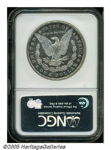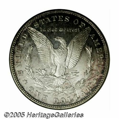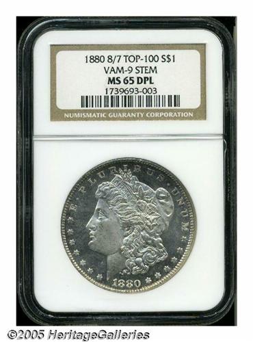 <B>1880<S$1> 8 Over 7 MS65 Deep Mirror Prooflike NGC.</B></I> VAM-9. A Top 100 Variety. The 'Stem Overdate,' identified by traces of die fill within both loops of the second 8 in the date. Medium blue-green and mauve hues embrace the margins. This nicely struck Gem exhibits moderate contrast between the frosty devices and the reflective fields. Apparently a very rare VAM with prooflike surfaces, NGC has only certified one example of VAM-9 as Deep Mirror Prooflike (the present piece) and none as Prooflike. PCGS has not certified any 1880 8 over 7 Dollars as Deep Mirror Prooflike.