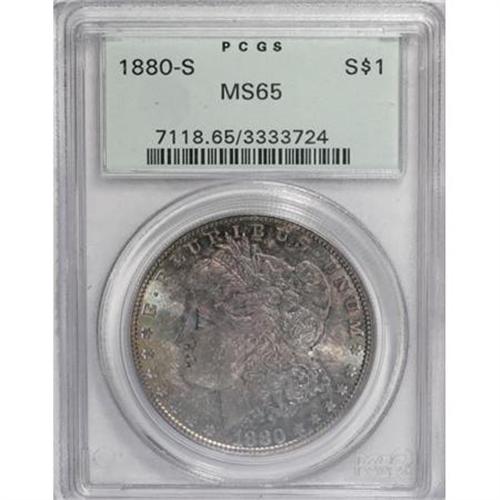 <B>1880-S $1 8 Over 7 Crossbar MS65 PCGS. VAM-10. A Top 100 Variety. </B></I>The Top 100 book states "VAM-10 is the stopper of the 1880-S Overdate set and is quite desirable." Housed in a green label holder, and undesignated by VAM.<BR><BR><B>Coin Engraver:</B> George T. Morgan<BR><BR><b>Shipping:</b> Coins & Currency (<a target="_blank" href="http://www.heritageauctions.com/common/shipping.php">view shipping information</a>)