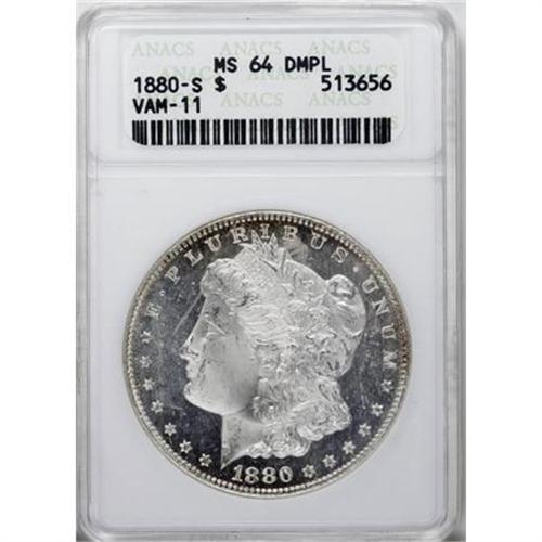 <B>1880-S $1 MS64 Deep Mirror Prooflike ANACS. </B></I>VAM-11<B>.</B></I> NGC Census: (746/558). PCGS Population (860/805). Numismedia Wsl. Price for NGC/PCGS coin in MS64: $260. (#97119)<BR><BR><b>Shipping:</b> Coins & Currency (<a target="_blank" href="http://www.heritageauctions.com/common/shipping.php">view shipping information</a>)