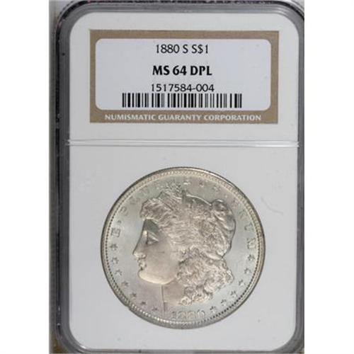 <B>1880-S $1 MS64 Deep Mirror Prooflike NGC.</B></I> NGC Census: (723/553). PCGS Population (856/802). Numismedia Wsl. Price for NGC/PCGS coin in MS64: $260. (#97119)<BR><BR><b>Shipping:</b> Coins & Currency (<a target="_blank" href="http://www.heritageauctions.com/common/shipping.php">view shipping information</a>)