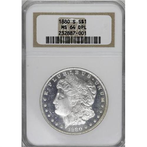 <B>1880-S $1 MS64 Deep Mirror Prooflike NGC.</B></I> NGC Census: (738/555). PCGS Population (859/801). Numismedia Wsl. Price for NGC/PCGS coin in MS64: $260. (#97119)<BR><BR><b>Shipping:</b> Coins & Currency (<a target="_blank" href="http://www.heritageauctions.com/common/shipping.php">view shipping information</a>)