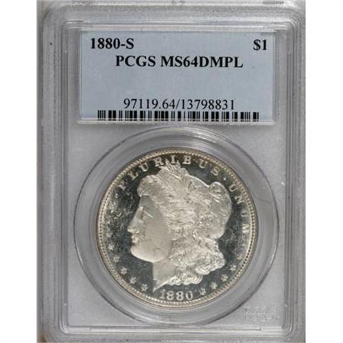 <B>1880-S $1 MS64 Deep Mirror Prooflike PCGS.</B></I> PCGS Population (856/802). NGC Census: (723/553). Numismedia Wsl. Price for NGC/PCGS coin in MS64: $260. (#97119)<BR><BR><b>Shipping:</b> Coins & Currency (<a target="_blank" href="http://www.heritageauctions.com/common/shipping.php">view shipping information</a>)