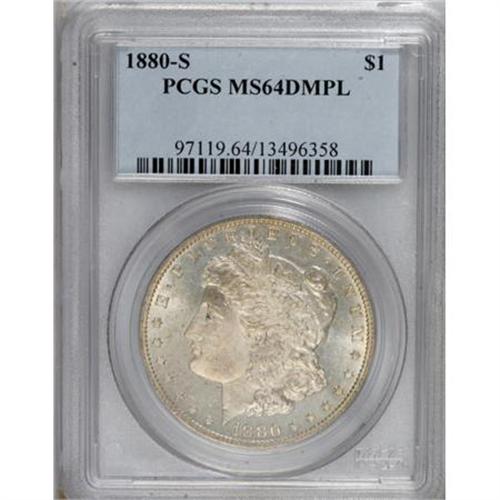 <B>1880-S $1 MS64 Deep Mirror Prooflike PCGS.</B></I> PCGS Population (858/801). NGC Census: (723/553). Numismedia Wsl. Price for NGC/PCGS coin in MS64: $260. (#97119)<BR><BR><b>Shipping:</b> Coins & Currency (<a target="_blank" href="http://www.heritageauctions.com/common/shipping.php">view shipping information</a>)