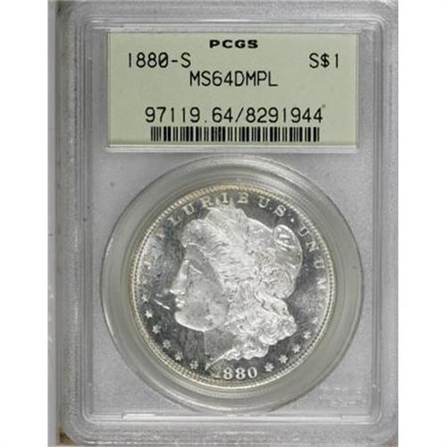 <B>1880-S $1 MS64 Deep Mirror Prooflike PCGS.</B></I> PCGS Population (859/803). NGC Census: (739/555). Numismedia Wsl. Price for NGC/PCGS coin in MS64: $260. (#97119)<BR><BR><b>Shipping:</b> Coins & Currency (<a target="_blank" href="http://www.heritageauctions.com/common/shipping.php">view shipping information</a>)