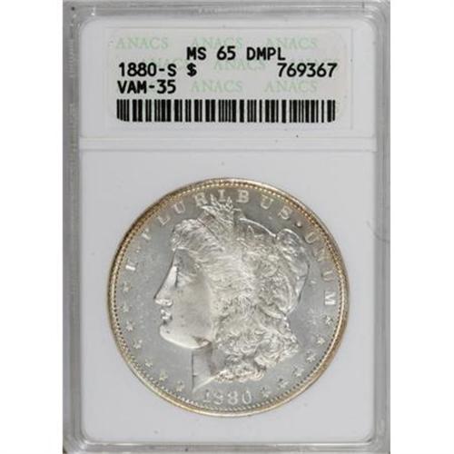 <B>1880-S $1 MS65 Deep Mirror Prooflike ANACS.</B></I> VAM-35. NGC Census: (425/128). PCGS Population (593/206). Numismedia Wsl. Price for NGC/PCGS coin in MS65: $585. (#97119)<BR><BR><b>Shipping:</b> Coins & Currency (<a target="_blank" href="http://www.heritageauctions.com/common/shipping.php">view shipping information</a>)