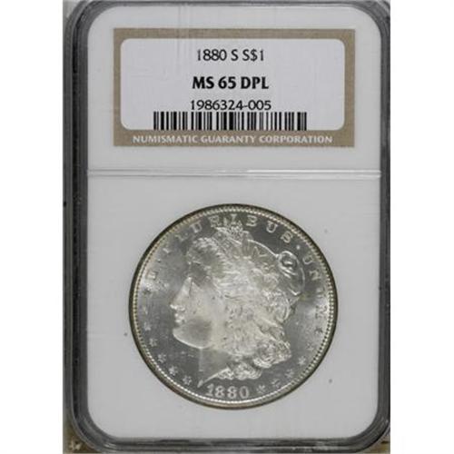 <B>1880-S $1 MS65 Deep Mirror Prooflike NGC.</B></I> NGC Census: (428/130). PCGS Population (597/207). Numismedia Wsl. Price for NGC/PCGS coin in MS65: $630. (#97119)<BR><BR><b>Shipping:</b> Coins & Currency (<a target="_blank" href="http://www.heritageauctions.com/common/shipping.php">view shipping information</a>)