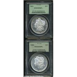 <B>1880<S$1> MS63 Deep Mirror Prooflike PCGS,</B></I> brilliant, boldly struck, flashy mirrors, unmarked for the grade; and an <B>1881 MS63 Deep Mirror Prooflike PCGS,</B></I> needle-sharp, good contrast, nearly brilliant, a minor scuff in the left obverse field but the cheek is fairly clean. 2 Coins <BR><BR><B>Important notice:</B> Heritage usually auctions material at the rate of 200-250 lots per hour. On some occasions eBay Live bid software or the Internet may not be able to keep up with the pace of the auction. We recommend placing a realistic absentee bid now as insurance to avoid disappointment. Occasionally the auctioneer may eliminate or reject an eBay Live bid, and the auctioneer may also reopen a lot after the close of the eBay live bidding (usually because we missed an audience bid), and may reject your bid even if it shows you as the winning bidder. By bidding via eBay Live, you agree that Heritage may award the lot to another bidder at its sole discretion under the circumstances described above or any other reasonable circumstances. Since eBay bids are not shown to us until we open the lot on the floor, we treat those bids just like floor bids. In most cases the floor responds before the eBay bid is presented to us, due to Internet lag time, so for consistency we have made it a policy that floor bids are always considered first over tie eBay live bids. Also please note that all Heritage lots purchased through eBay Live carry a 20% Buyer's Premium. Please make sure you read the Terms and Conditions before you bid.