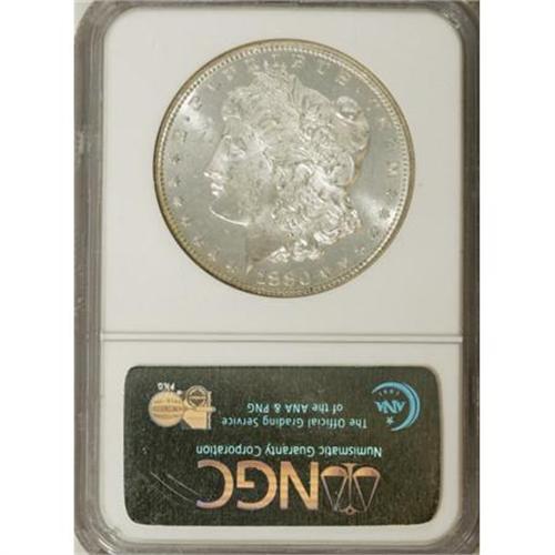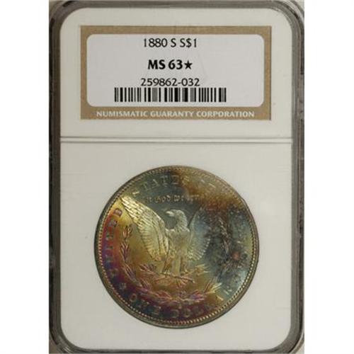 <B>1880-S $1 MS63 <img border='0' src='http://www.heritagecoins.com/images/star.gif' width=10 height=10> NGC.</B></I> Medium S. Magnificent gold, violet-red, and steel-blue endow the reverse of this moderately prooflike silver dollar.<BR><BR><B>Coin Engraver:</B> George T. Morgan<BR><BR><b>Shipping:</b> Coins & Currency (<a target="_blank" href="http://www.heritageauctions.com/common/shipping.php">view shipping information</a>)