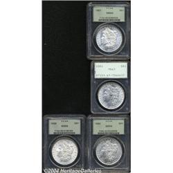 <B>1880<S$1> MS64 PCGS,</B></I> nice satiny luster, with a few light marks that limit the grade; <B>1881 MS63 PCGS,</B></I> nicely struck, save for weakness in the central areas, and housed in a first generation PCGS holder; <B>1881 MS64 PCGS,</B></I> virtually untoned and brilliant; and an <B>1889 MS64 PCGS,</B></I> light silver-gray, and generally well struck. 4 coins <BR><BR><B>Important notice:</B> Heritage usually auctions material at the rate of 200-250 lots per hour. On some occasions eBay Live bid software or the Internet may not be able to keep up with the pace of the auction. We recommend placing a realistic absentee bid now as insurance to avoid disappointment. Occasionally the auctioneer may eliminate or reject an eBay Live bid, and the auctioneer may also reopen a lot after the close of the eBay live bidding (usually because we missed an audience bid), and may reject your bid even if it shows you as the winning bidder. By bidding via eBay Live, you agree that Heritage may award the lot to another bidder at its sole discretion under the circumstances described above or any other reasonable circumstances. Since eBay bids are not shown to us until we open the lot on the floor, we treat those bids just like floor bids. In most cases the floor responds before the eBay bid is presented to us, due to Internet lag time, so for consistency we have made it a policy that floor bids are always considered first over tie eBay live bids. Also please note that all Heritage lots purchased through eBay Live carry a 20% Buyer's Premium. Please make sure you read the Terms and Conditions before you bid.