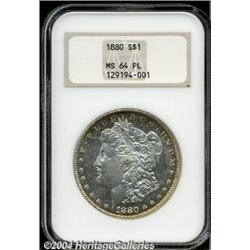 <B>1880<S$1> MS64 Prooflike NGC.</B></I> Essentially brilliant with significant flash for this difficult early P-mint and only a few slight obverse blemishes. Most prooflike examples are said to have originated from a single bag 1880 Dollars. <BR><BR><B>Important notice:</B> Heritage usually auctions material at the rate of 200-250 lots per hour. On some occasions eBay Live bid software or the Internet may not be able to keep up with the pace of the auction. We recommend placing a realistic absentee bid now as insurance to avoid disappointment. Occasionally the auctioneer may eliminate or reject an eBay Live bid, and the auctioneer may also reopen a lot after the close of the eBay live bidding (usually because we missed an audience bid), and may reject your bid even if it shows you as the winning bidder. By bidding via eBay Live, you agree that Heritage may award the lot to another bidder at its sole discretion under the circumstances described above or any other reasonable circumstances. Since eBay bids are not shown to us until we open the lot on the floor, we treat those bids just like floor bids. In most cases the floor responds before the eBay bid is presented to us, due to Internet lag time, so for consistency we have made it a policy that floor bids are always considered first over tie eBay live bids. Also please note that all Heritage lots purchased through eBay Live carry a 20% Buyer's Premium. Please make sure you read the Terms and Conditions before you bid.