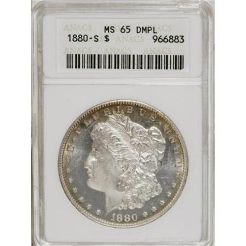 <B>1880-S $1 MS65 Deep Mirror Prooflike ANACS.</B></I> Large S. Sharply struck with beautiful, intense mint frost on the devices and astonishingly deep reflectivity in the fields. A small degree of pretty gold and tan peripheral toning appears on each side. This issue is not rare with Deep Mirror Prooflike surfaces, but such coins also grading finer than MS65 are definitely scarce.<BR><I>From The Leroy Van Allen Collection.</B></I><BR><BR><b>Shipping:</b> Coins & Currency (<a target="_blank" href="http://www.heritageauctions.com/common/shipping.php">view shipping information</a>)