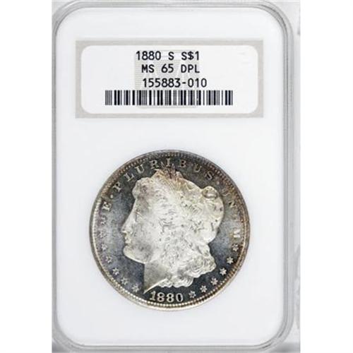 <B>1880-S $1 MS65 Deep Mirror Prooflike NGC.</B></I> Relatively strong field-motif contrast results from the deeply mirrored prooflike surfaces of this lovely Gem. A well executed strike leaves excellent detail in the hair at Liberty's ear and on the eagle's breast feathers, and occasional splashes of golden-tan and purple color are visible over each side. Well preserved throughout.<BR><BR><b>Shipping:</b> Coins & Currency (<a target="_blank" href="http://www.heritageauctions.com/common/shipping.php">view shipping information</a>)