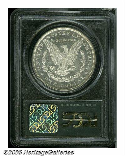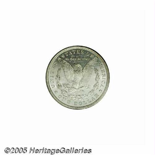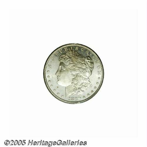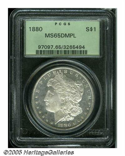 <B>1880<S$1> MS65 Deep Mirror Prooflike PCGS.</B></I> A large portion of the original 12+ million coin mintage of 1880 Morgan Silver Dollars were stored in the Treasury vaults for several decades, most being released in the 1940s and 1950s. By the time of the massive Treasury release of the early 1960s, few examples of this date remained. Examples with prooflike or deep mirror prooflike surfaces are few and far between. Most of the latter have, as their source, a single bag of 1,000 coins that was located in the early 1970s, according to Wayne Miller. This example is a delightful dollar with deeply mirrored fields and excellent cameo contrast. The surfaces are fully brilliant without any evidence of toning on either side. A small copper spot below Liberty's chin may serve to identify the pedigree of this example. The few light abrasions that are present on the surfaces are reflected in the mirrored fields and appear more extensive than they actually are. Only one finer example has been certified by PCGS. Population: 27 in 65, 1 finer (5/05).